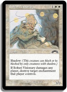 Shadow. If Soltari Visionary damages any player, destroy target enchantment that player controls.
