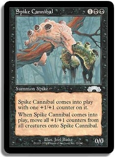 Spike Cannibal comes into play with a +1/+1 counter. When Spike Cannibal comes into play, remove all +1/+1 counters from all creatures in play and put them on Spike Cannibal.