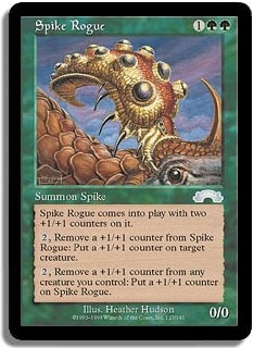 Spike Rogue comes into play with two +1/+1 counters on it. <2, Remove a +1/+1 counter from Spike Rogue>: Put a +1/+1 counter on target creature. <2, Remove a +1/+1 counter from any creature you control>: Put a +1/+1 counter on Spike Rogue.