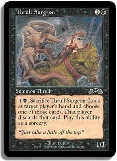 <1B, Sacrifice Thrull Surgeon>: Look at target player's hand and choose one of those cards. That player discards that card. Play this ability as a sorcery.