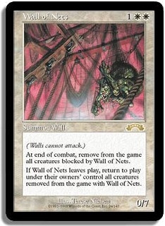 At the end of combat, remove all creatures blocked by Wall of Nets from the game. If Wall of Nets leaves play, return all creatures removed from the game by Wall of Nets into play under their owner's control.