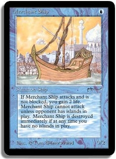 If Merchant Ship attacks and is not blocked, you gain 2 life. Merchant Ship cannot attack unless opponent has islands in play. Merchant Ship is destroyed immediately if at any time you have no islands in play.