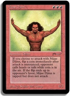 If you choose to attack with Mijae Djinn, flip a coin immediately after attack is announced; opponent calls heads or tails while coin is in the air. If the flip ends up in opponent's favor, Mijae Djinn is tapped but does not attack.