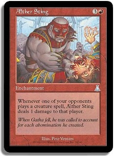 Whenever one of your opponents plays a creature spell, Aether Sting deals 1 damage to that player.