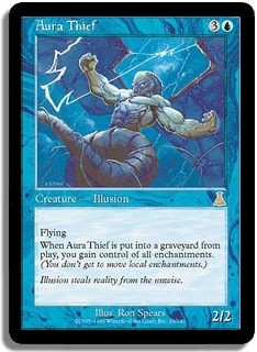 Flying. When Aura Thief is put into a graveyard from play, you gain control of all enchantments. (You don't get to move local enchantments.)