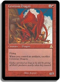Flying. When you control no artifacts, sacrifice Covetous Dragon.
