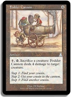 <4, T, Sacrifice a creature>: Fodder Cannon deals 4 damage to target creature.