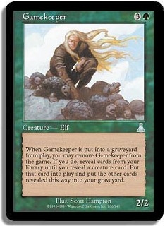 When Gamekeeper is put into a graveyard from play, you may remove Gamekeeper from the game. If you do, reveal cards from your library until you reveal a creature card. Put that card into play and put the other cards revealed this way into your graveyard.