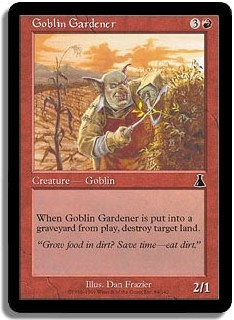 When Goblin Gardener is put into a graveyard from play, destroy target land.
