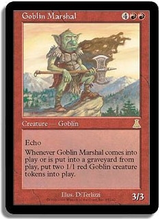 Echo. Whenever Goblin Marshal comes into play or is put into a graveyard from play, put two 1/1 red Goblin creature tokens into play.