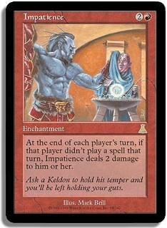 At the end of each player's turn, if that player didn't play a spell that turn, Impatience deals 2 damage to him or her.
