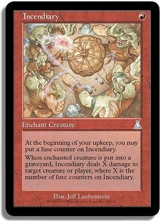 At the beginning of your upkeep, you may put a fuse counter on Incendiary. When enchanted creature is put into a graveyard, Incendiary deals X damage to target creature or player, where X is the number of fuse counters on Incendiary.