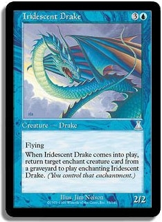 Flying. When Iridescent Drake comes into play, return target enchant creature card from a graveyard to play enchanting Iridescent Drake. (You control that enchantment.)