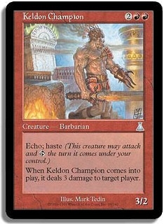 Echo. haste (This creature may attack and <T> the turn it comes under your control.) When Keldon Champion comes into play, it deals 3 damage to target player.