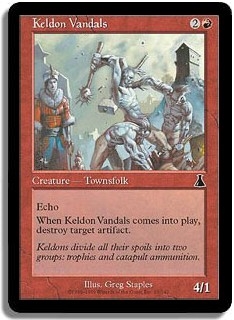 Echo. When Keldon Vandals comes into play, destroy target artifact.