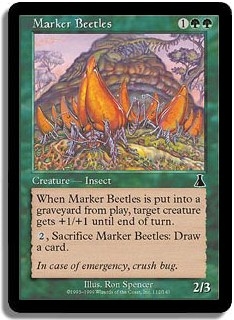 When Marker Beetles is put into a graveyard from play, target creature gets +1/+1 until end of turn. <2, Sacrifice Marker Beetles>: Draw a card.