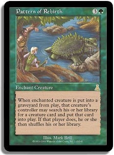When enchanted creature is put into a graveyard from play, that creature's controller may search his or her library for a creature card and put that card into play. If that player does, he or she then shuffles his or her library.