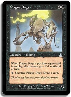 When Plague Dogs is put into a graveyard from play, all creatures get -1/-1 until end of turn. <2, Sacrifice Plague Dogs>: Draw a card.