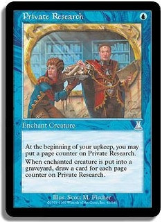 At the beginning of your upkeep, you may put a page counter on Private Research. When enchanted creature is put into a graveyard, draw a card for each page counter on Private Research.