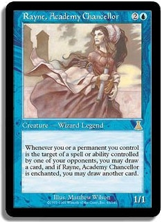 Whenever you or a permanent you control is the target of a spell or ability controlled by one of your opponents, you may draw a card, and if Rayne, Academy Chancellor is enchanted, you may draw another card.