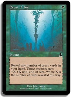 Reveal any number of green cards in your hand. Target creature gets +X/+X until end of turn, where X is the number of cards revealed this way.