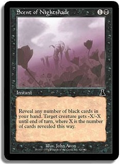 Reveal any number of black cards in your hand. Target creature gets -X/-X until end of turn, where X is the number of cards revealed this way.