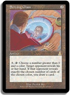 <3, T>: Choose a number greater than 0 and a color. Target opponent reveals his or her hand. If that opponent reveals exactly the chosen number of cards of the chosen color, you draw a card.