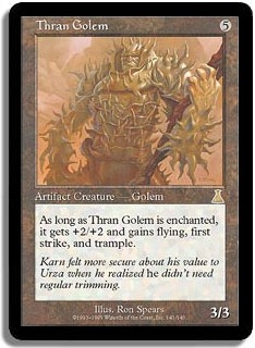 As long as Thran Golem is enchanted, it gets +2/+2 and gains flying, first strike, and trample.