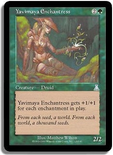 Yavimaya Enchantress gets +1/+1 for each enchantment in play.