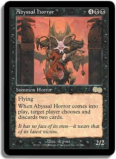 Flying. When Abyssal Horror comes into play, target player chooses and discards two cards.