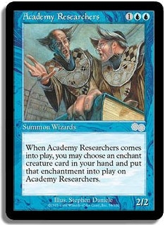 When Academy Researchers comes into play, you may choose an enchant creature card in your hand and put that enchantment into play on Academy Researchers.