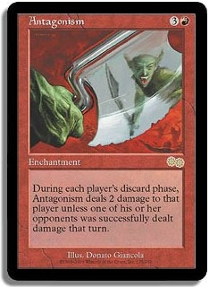 During each player's discard phase, Antagonism deals 2 damage to that player unless one of his or her opponents was successfully dealt damage that turn.