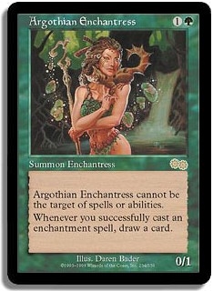 Argothian Enchantress cannot be the target of spells or abilities. Whenever you successfully cast an enchantment spell, draw a card.