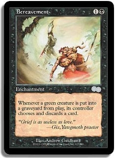 Whenever a green creature is put into a graveyard from play, its controller chooses and discards a card.