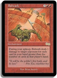 During your upkeep, Bulwark deals 1 damage to target opponent for each card in your hand greater than the number of cards in that player's hand.