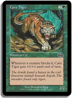 Whenever a creature blocks it, Cave Tiger gets +1/+1 until end of turn.