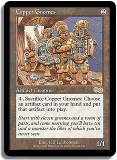 <4,Sacrifice Copper Gnomes>: Choose an artifact card in your hand and put that artifact into play.