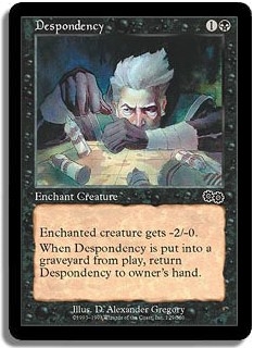 Enchanted creature gets -2/-0. When Despondency is put into a graveyard from play, return Despondency to owner's hand.