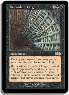 During your upkeep, you may put a verse counter on Discordant Dirge. <B,Sacrifice Discordant Dirge>: Look at target opponent's hand and choose up to X of those cards, where X is the number of verse counters on Discordant Dirge. That player discards those cards.