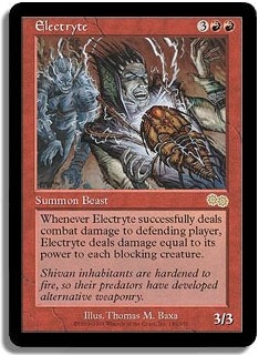 Whenever Electryte succesfully deals combat damage to defending player, Electryte deals damage equal to its power to each blocking creature.