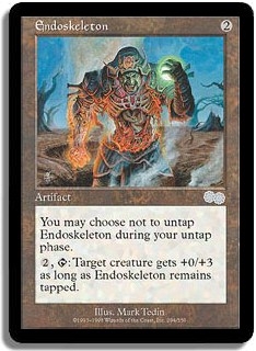 You may choose not to untap Endoskeleton during your untap phase. <2,T>: Target creature gets +0/+3 as long as Endoskeleton remains tapped.