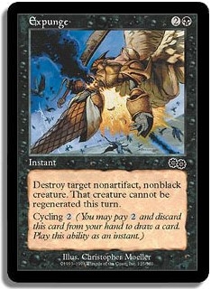 Destroy target nonartifact, nonblack creature. That creature cannot be regenerated this turn. Cycling <2>.
