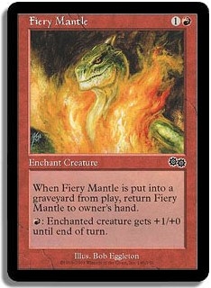 When Fiery Mantle is put into a graveyard from play, return Fiery Mantle to owner's hand. <R>: Enchanted Creature gents +1/+0 until end of turn.