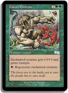 Enchanted creature gets +3/+3 and gains trample. <G>: Regenerate enchanted creature.