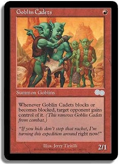 Whenever Goblin Cadets blocks or becomes blocked, target opponent gains control of it. (This removes Goblin Cadets from combat.)