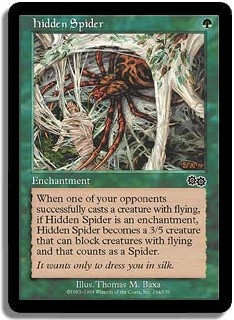 When one of your opponents successfully casts a creature with flying, if Hidden Spider is an enchantment, Hidden Spider becomes a 3/5 creature that can block creatures with flying and that counts as a Spider.