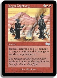 Jagged Lightning deals 3 damage to target creature and 3 damage to another target creature.