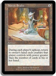 During each player's upkeep, return to owner's hand each creature that player controls with power greater than the number of cards in his or her hand.