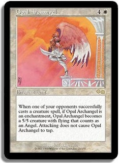 When one of your opponents succesfully casts a creature spell, if Opal Archangel is an enchantment, Opal Archangel becomes a 5/5 creature with flying that counts as an Angel. Attacking does not cause Opal Archangel to tap.