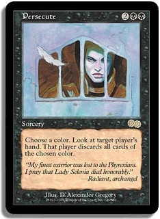 Choose a color. Look at target player's hand. That player discards all cards of the chosen color.